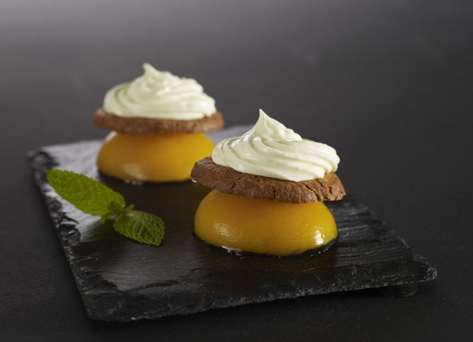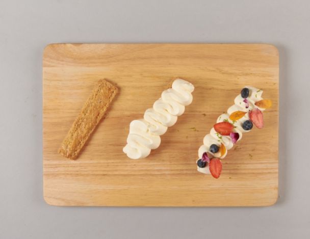 Monter la crème délicatement avec le mascarpone, le sucre et le jaune d’œuf, finir avec le jus de citron. Une fois la crème bien homogène, la disposer dans une poche avec une douille « chemin de fer ». Conserver au frais.