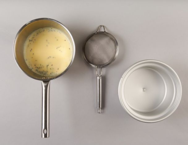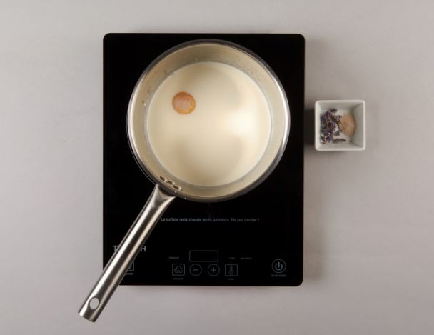 Cuire au bain marie à 84°C le lait, la crème, le jaune, le sucre et le glucose. Ajouter le stabilisateur, puis laisser infuser la lavande une nuit entière.