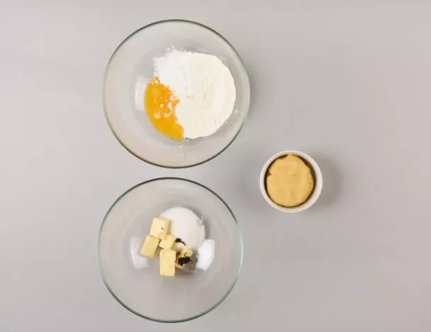 Blanchir le beurre avec le sel et le sucre, incorporer la vanille et le jaune petit à petit, puis la farine et la levure, réservé au frais une nuit.