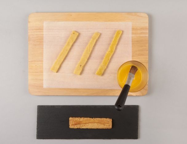 Abaisser la pâte du sablé, puis détailler en rectangles de 13 cm/ 1 cm, dorer au jaune d’œuf, rayer à la fourchette et cuire à 170°C dans un four à sec pendant 12 minutes.