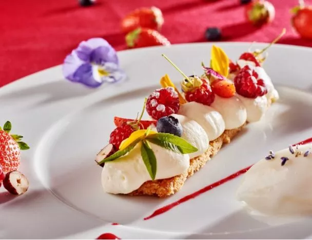 Cette délicieuse recette de sablé breton, mousse de mascarpone aux fruits rouges, crème lavande, est une composition du chef Colagreco. Pour un dessert coloré, frais et léger !