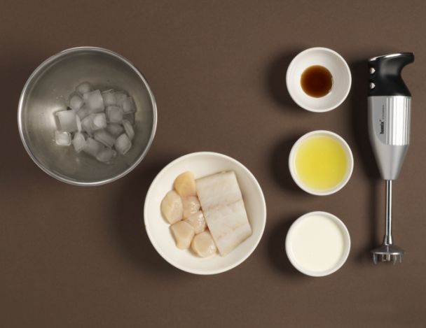 MoyenMixer les noix de St Jacques, les blancs d'œufs, la chair de poisson blanc, le jus de truffe, et la crème liquide ensemble, dans un cul de poule rempli de glaçons. Ajouter sel et poivre.