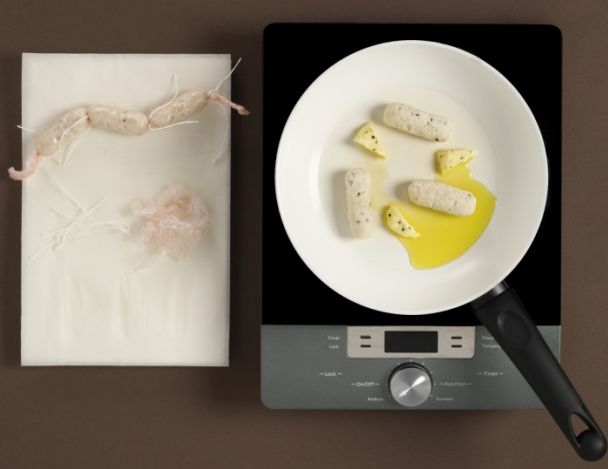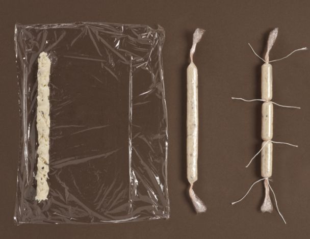 Insérer le tout dans une poche à douille. Sur un papier film, coucher la préparation. Rouler la préparation dans du papier film. Ficeler de façon à former des boudins de 7 cm de long.