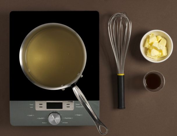 Faire chauffer le bouillon de volaille avec un peu de jus de truffe. Monter au beurre le tout.