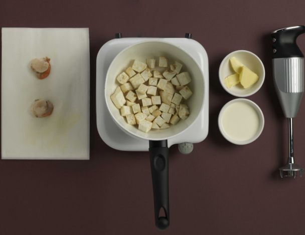 Démarrer la purée de céleri, éplucher et tailler le céleri en cube.