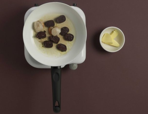 Eplucher le boudin puis démarrer dans une poêle bien chaude les lamelles de boudin et les Saint-Jacques.
