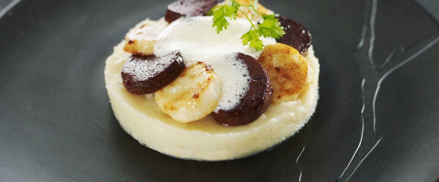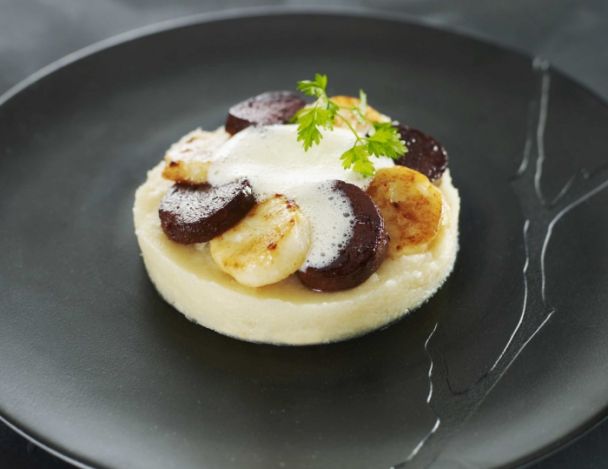 Déposer la purée de céleri dans le fond de l’assiette. Surmonter de boudin et des Saint Jacques et finaliser avec l'émulsion de bardes.