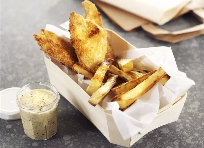 Tailler des petits dès régulier de pomme de terre, les frire à 140°C. Dresser dans une assiette creuse, la soupe de poisson, l'émulsion de soupe et de pommes de terre. Ajouter le Saint Pierre.