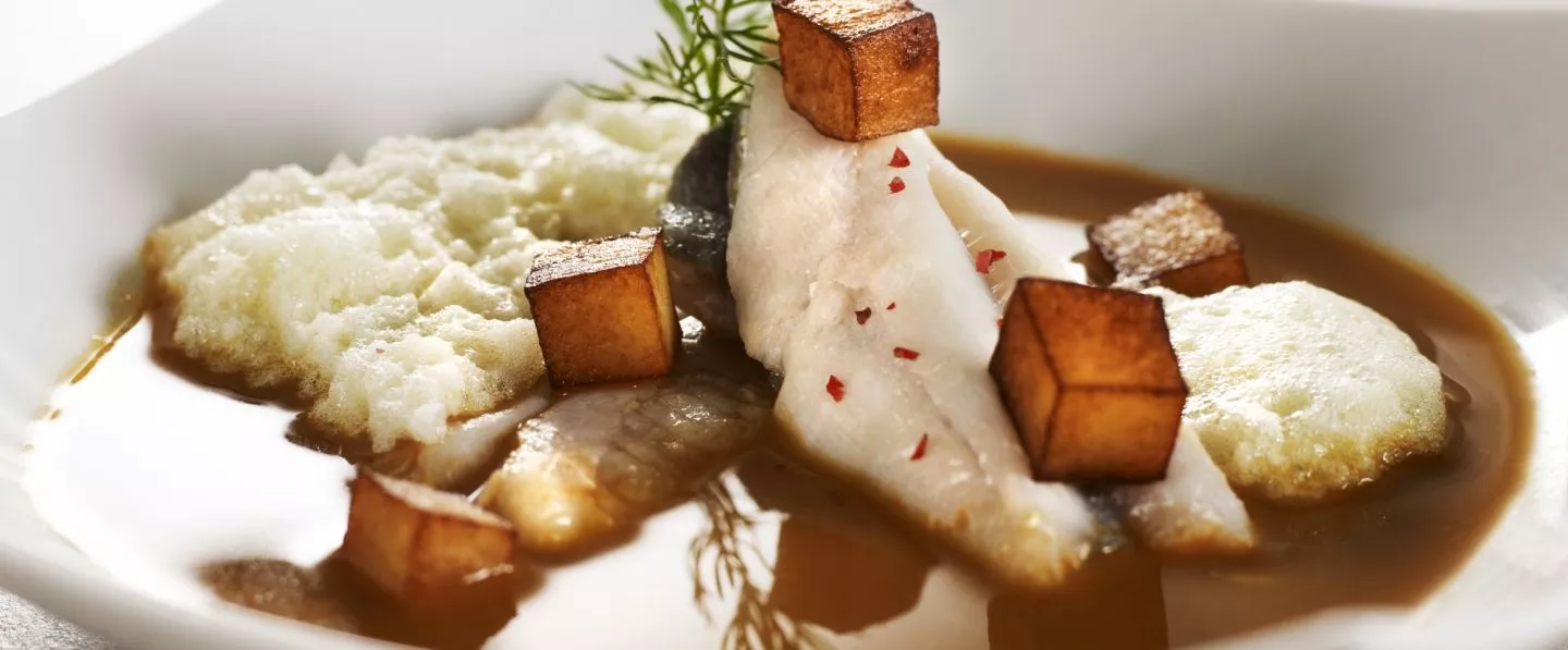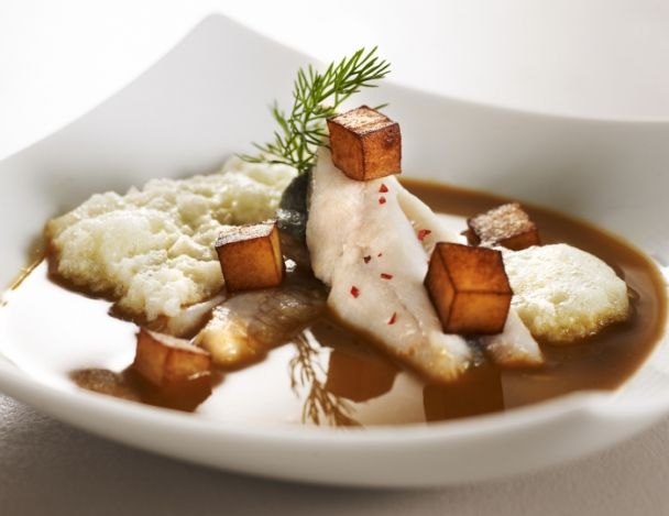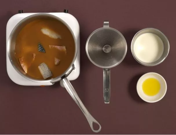 DifficileRéaliser une soupe de poisson classique. La passer au moulin à légumes et chinoiser En garder une partie pour pocher le St Pierre (aiguillettes). L’autre partie, ajouter crème liquide et huile d’argan, puis vérifier l’assaisonnement. Faire une émulsion avec