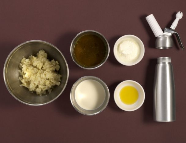 Cuire les pommes de terre en robe des champs la veille de préférence Les écraser et mixer avec l’ensemble des ingrédients. Mettre en siphon et ensuite au bain marie