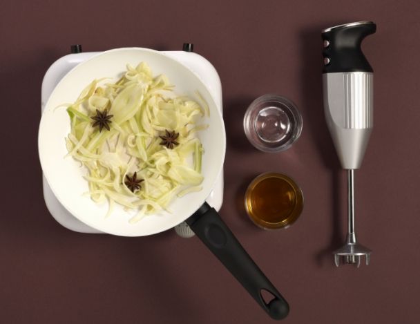 Émincer les fenouils. Suer avec sel, sucre, anis étoilé. Déglacer au pastis, mouiller à l’eau (moins de la hauteur). Une fois plus d’eau et le fenouil cuit, mixer