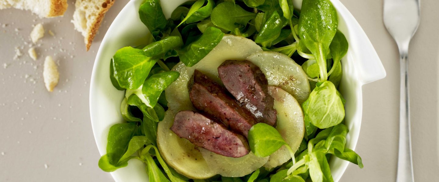 Poser les rondelles de fond d'artichaut par-dessus, en rosaces. Verser le reste de vinaigrette, en répartissant bien. Couper les foies de volaille en tranches et les disposer sur la salade.