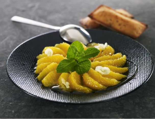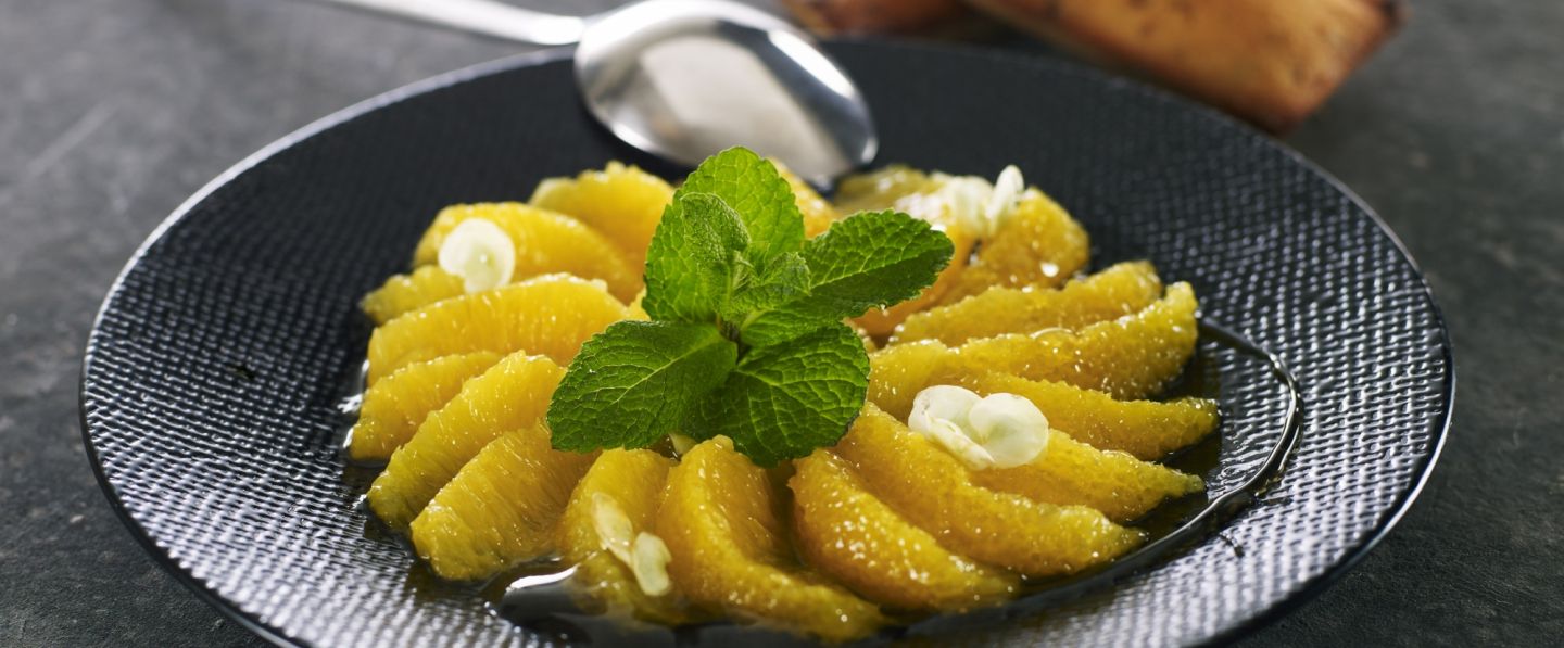 Pour un dessert aux teintes orientales de fleur d'oranger et de menthe, découvrez la recette de salade d'oranges à l'oriental, et financiers au miel du chef Thierry Bamas.