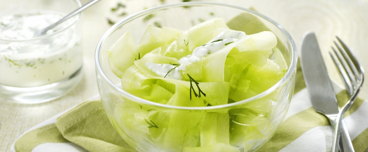FacilePeler le concombre puis, à l'aide d'une mandoline ou d'un couteau économe, découper en rubans dans le sens de la longueur. Répartir les rubans de concombre dans 4 bols, puis les mettre au réfrigérateur.