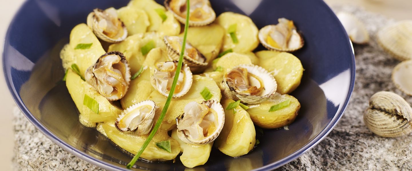 FacileÉplucher et hacher finement la ciboulette. Couper en deux les pommes de terre, les ajouter aux coques dans le saladier. Verser la vinaigrette, mélanger délicatement.