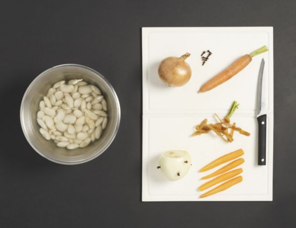 Mettre 300 g de haricots demi secs dans une casserole, les recouvrir d’eau froide, ils doivent être bien immergés, additionner la carotte, l’oignon piqué, 1 bouquet garni, assaisonner de gros sel, porter à frémissement et laisser mijoter 1 vingtaine de minutes. Égoutter au terme de la cuisson.