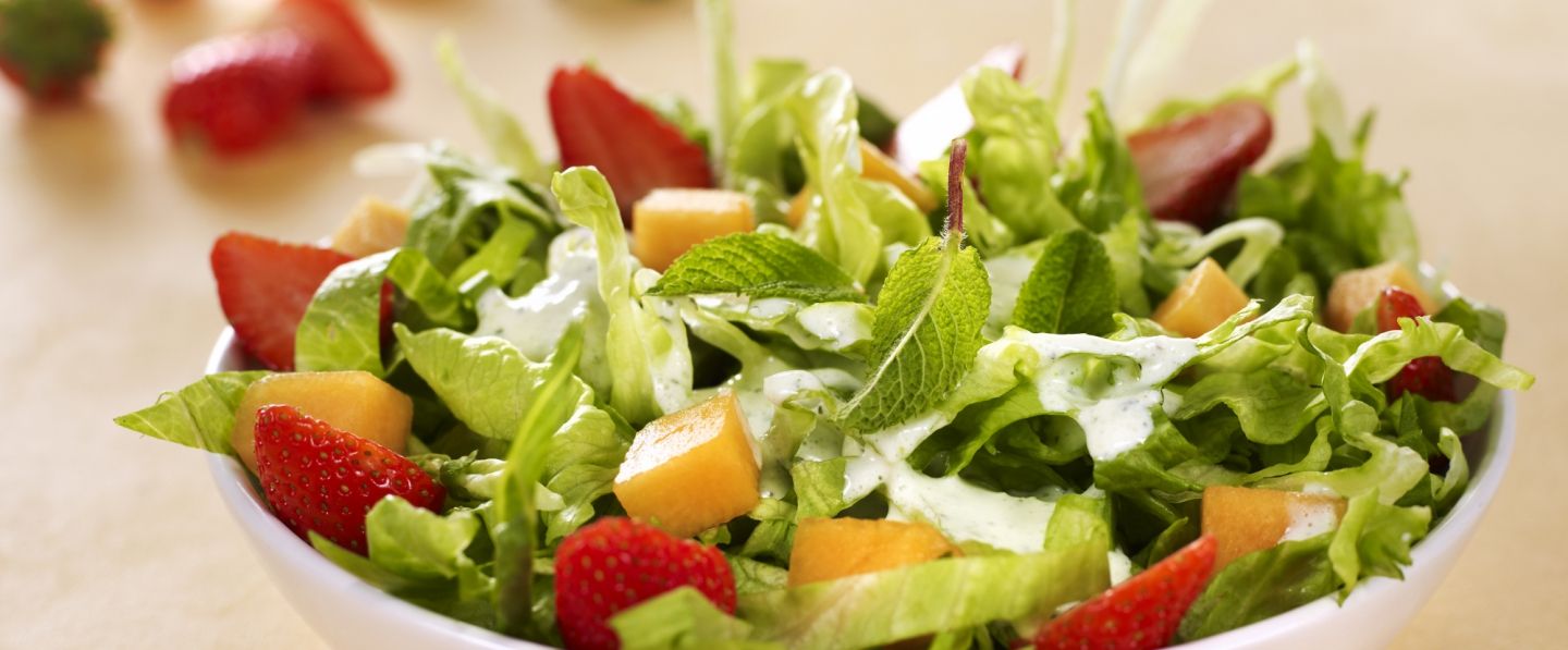 FacileCiseler la laitue et la répartir dans 4 assiettes. Couper le melon en quartiers dans la longueur. Épépiner, ôter la peau et détailler en cubes de 2,5 cm. Ajouter le melon dans les assiettes et garnir de fraises coupées en 2 et de rondelles de concombre.