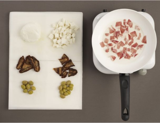 FacileDétailler la mozzarella et la coppa en cubes. Faire revenir la coppa pour qu'elle soit légèrement grillée. Couper les olives et les tomates séchées en deux