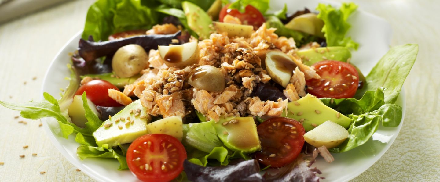 Ôter la peau et les arêtes du saumon, l'émietter et le répartir dans les assiettes. Ajouter les pommes de terre et garnir de graines de sésame. Pour la sauce, mélanger le jus de pomme et le vinaigre, poivrer et verser sur la salade. Servir immédiatement.