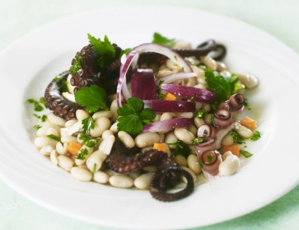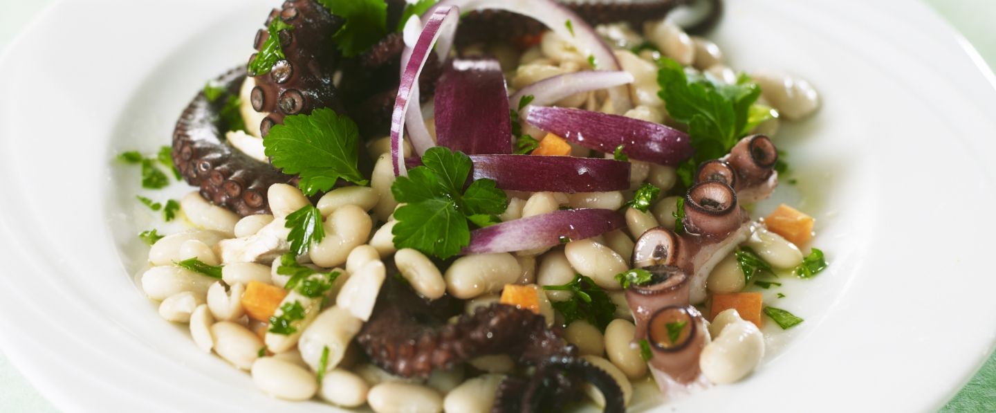 Egoutter les haricots. Egoutter le poulpe du bouillon et le couper en morceaux de 1cm. Saler un peu si nécessaire. Hacher les gousses d'ail restantes. Ciseler le persil plat. Ciseler l'oigon rouge.
