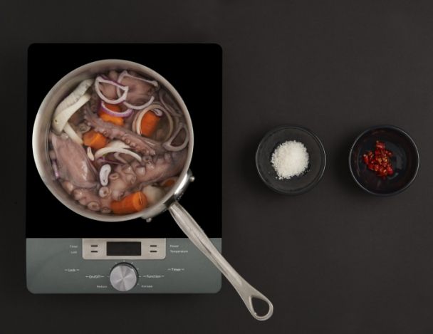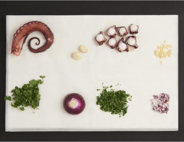 Demander à votre poissonnier d'ôter la poche et la bouche du poulpe et de ne garder que les tentacules. Laver à grande eau les tentacules du poulpe. Emincer l'oignon jaune, hacher 3 gousses d'ail.