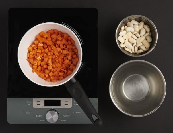 Tailler la carotte restante en petits dés de 3 mm. Dans une casserole, faire revenir les dés avec l'huile d'olive sans laisser colorer. Ajouter les haricots coco, verser de l'eau froide 1 cm au dessus des haricots. Saler avec du sel de Guérande. Faire cuire à couvert environ 1h à frémissement, les haricots doivent être fondants.