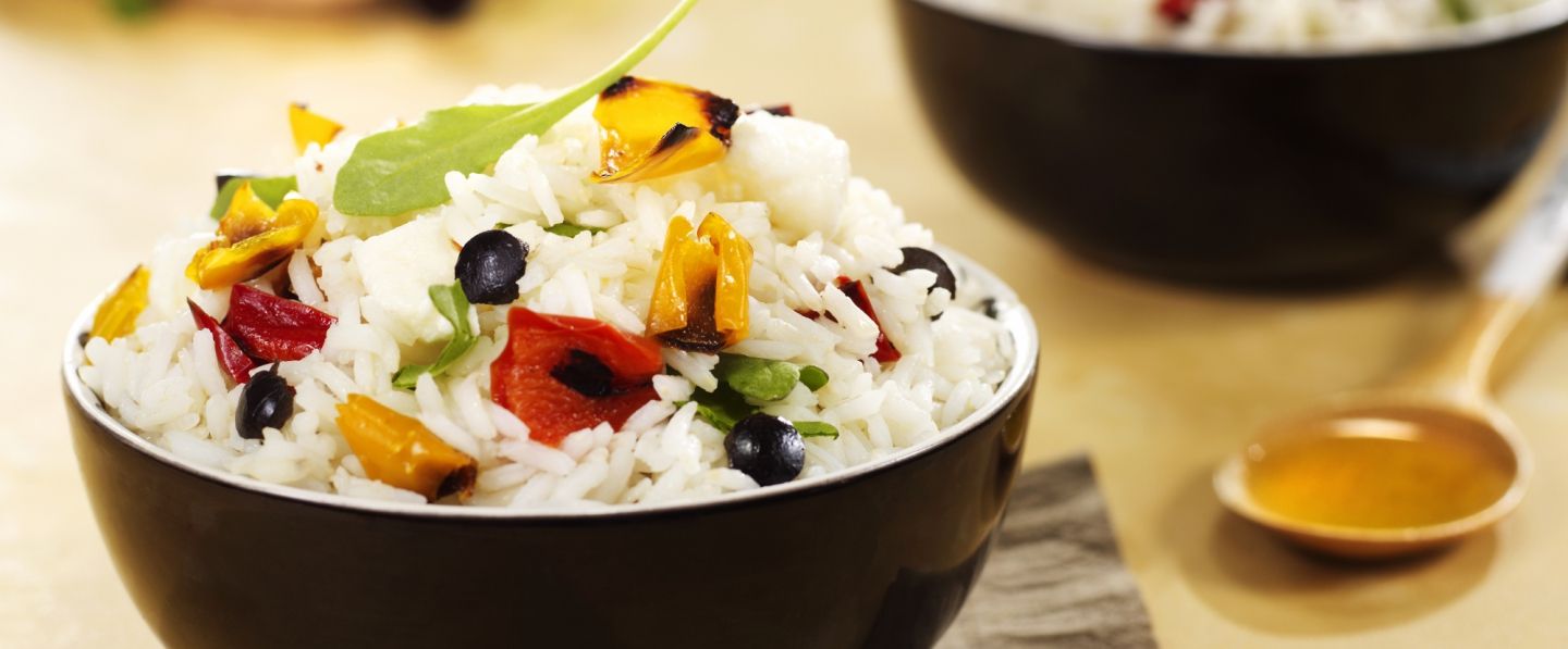 Dans un saladier, mélanger le riz refroidi avec les poivrons, les olives, la mozzarella et la roquette. Ajouter l'huile d'olive et le vinaigre balsamique, puis remuer le tout. Saler et poivrer.