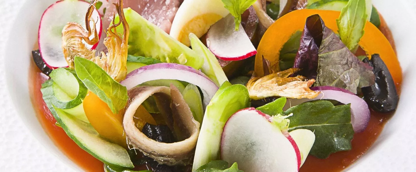 Sur la gelée de tomate au basilic, disposez dans chaque assiette votre salade préalablement lavée, les œufs de caille coupés en deux, les olives, les anchois, le thon, les tomates cerises puis tous les petits légumes crus. Assaisonnez avec la vinaigrette.