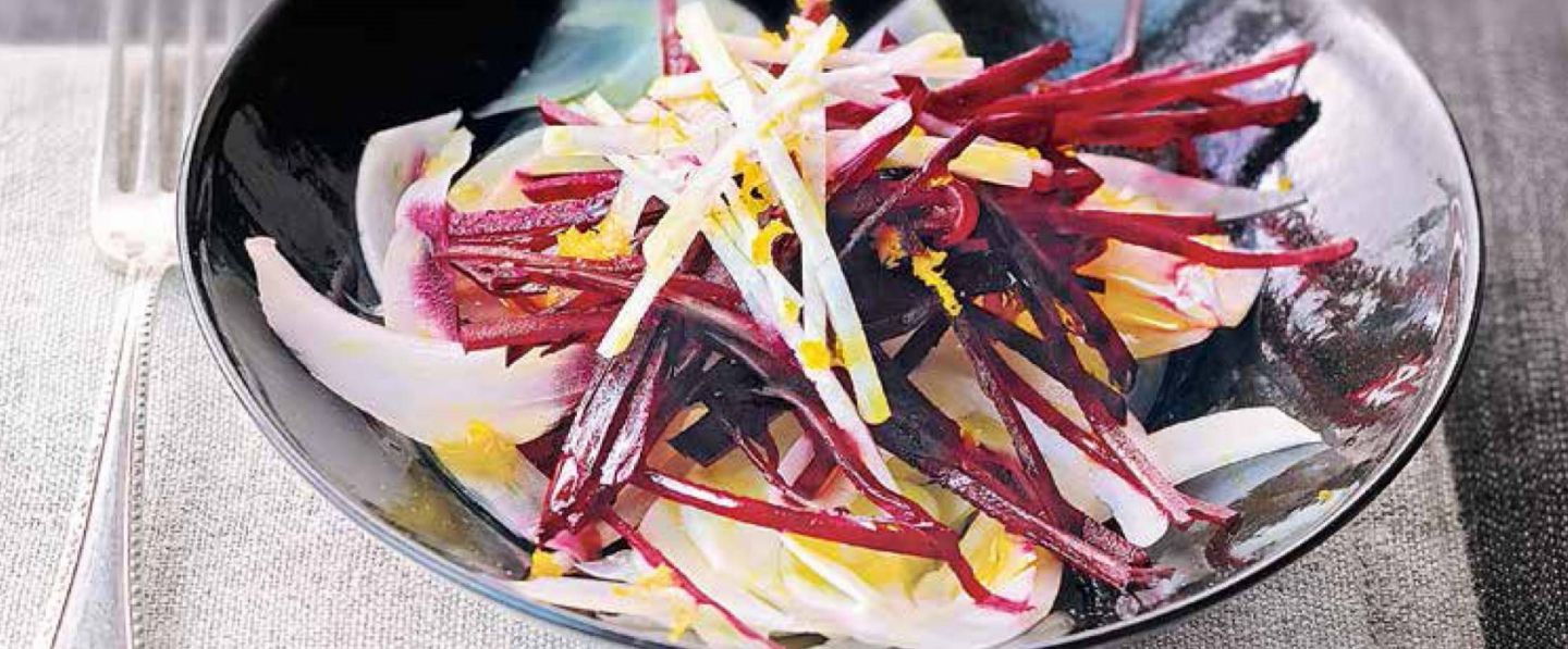 Dans chaque assiette, déposez une couche fine de fenouil râpé en formant un cercle de dix centimètres de diamètre environ. Ajoutez par-dessus un cercle plus petit de betterave râpée. Terminez par quelques lamelles de radis noir. Ajoutez la pointe d’un couteau de zeste d’orange.