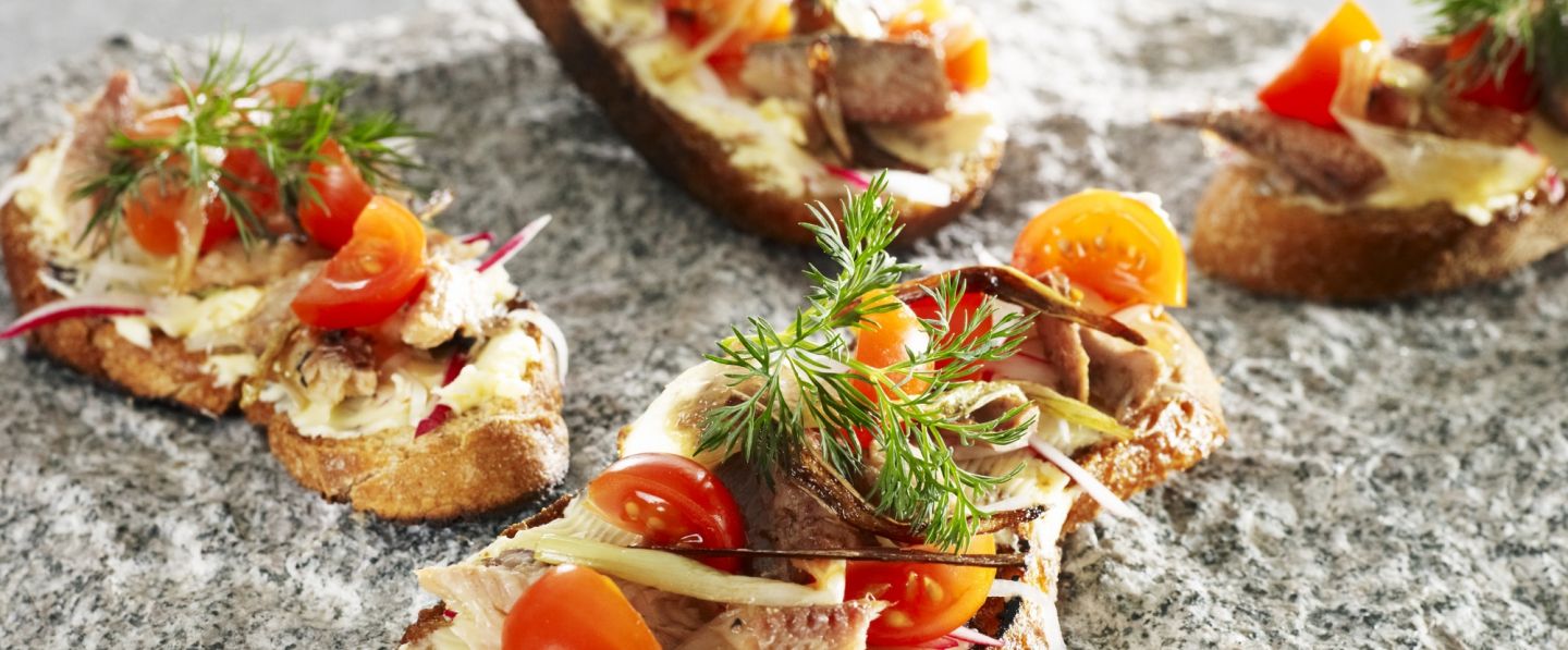 Tartiner de beurre au radis les croûtons, poser les sardines coupées en deux dans la longueur, couper en deux les tomates, ajouter les oignons grillés, les demi tomates et les pluches d'aneth. Servir aussitôt.