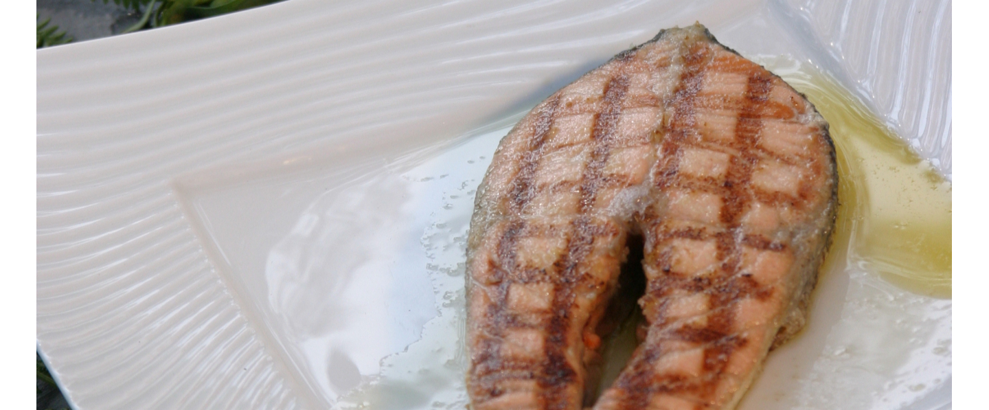 Badigeonner les tranches de saumon à l‘huile et les marquer sur la grille sans les ferrer (ceci est très important pour ne pas donner d‘amertume à la chair du saumon).