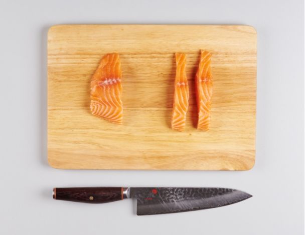 Une fois le temps passé, rincer longuement le saumon, éponger-le. Couper le saumon en lamelles de 2cm et le remettre au frais.