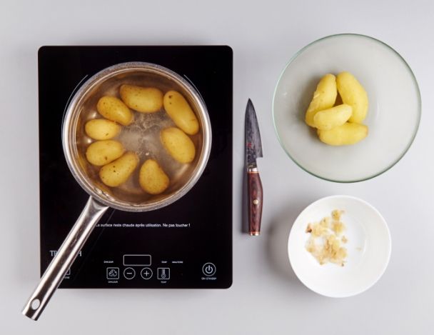 Cuire les rattes 10 à 12 min dans une casserole d'eau salée. Laisser tiédir avant de les peler.