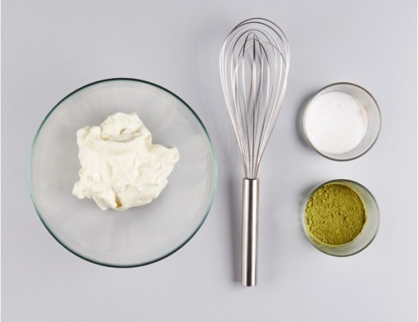 Verser la crème bien froide dans un saladier. Fouetter la crème en chantilly, ajouter de la fleur de sel et le thé matcha. Fouetter encore quelques secondes, et réserver au frais.