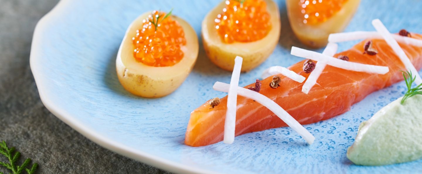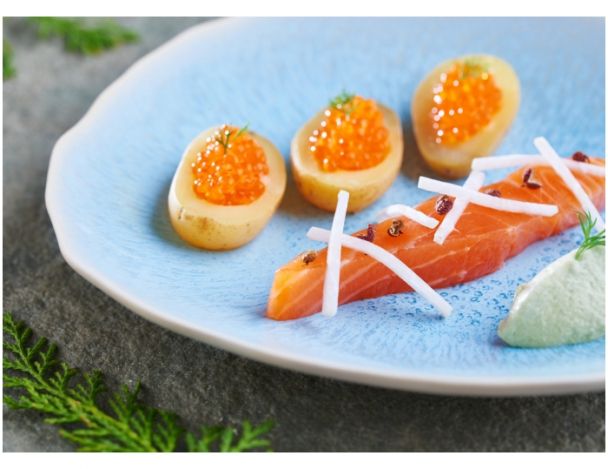 Couper en deux les rattes, les garnir d'œufs de saumon ou de truite. Puis répartir sur deux assiettes le radis noir râpé, les lamelles de saumon et les rattes. Ajouter une cuillère de chantilly et parsemer d'aneth.