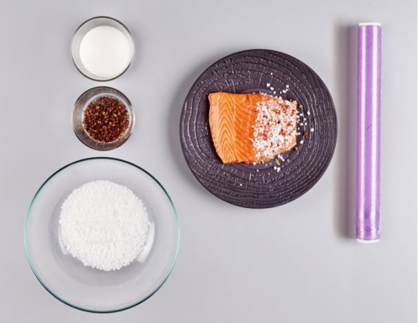 MoyenMélanger le gros sel, le sucre semoule et le poivre concassé. Parsemer le morceau de saumon de ce mélange des deux côtés. Envelopper-le dans du film alimentaire, réserver au frais pendant 3heures