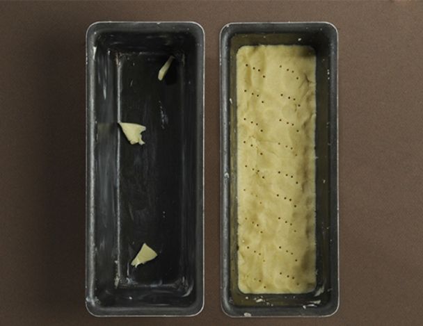 Blanchir sucre et beurre pommade. Ajouter la farine tamisée en continuant à tourner mélanger. Graisser un moule rectangulaire, mettre la pâte et étaler sur une épaisseur de 2cm.