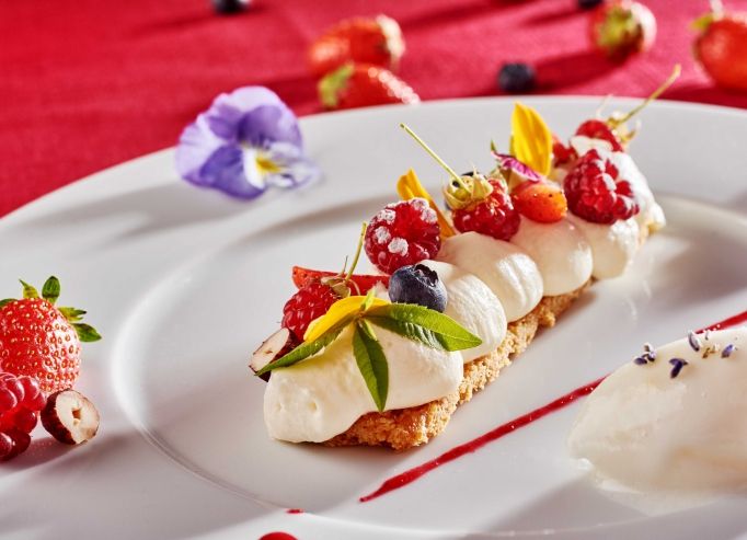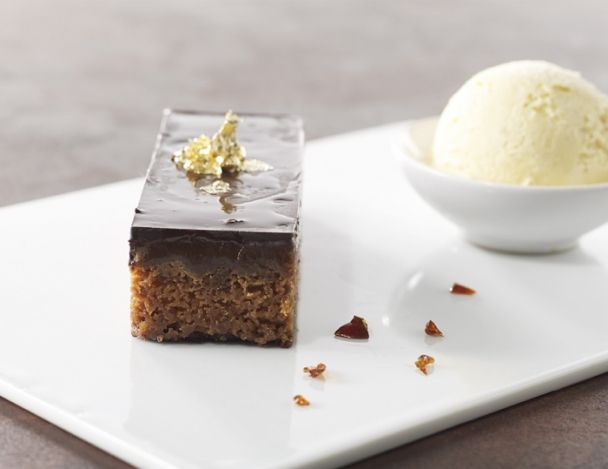 Dresser le shortbread sur une assiette, déposer une quenelle de glace alma mater.