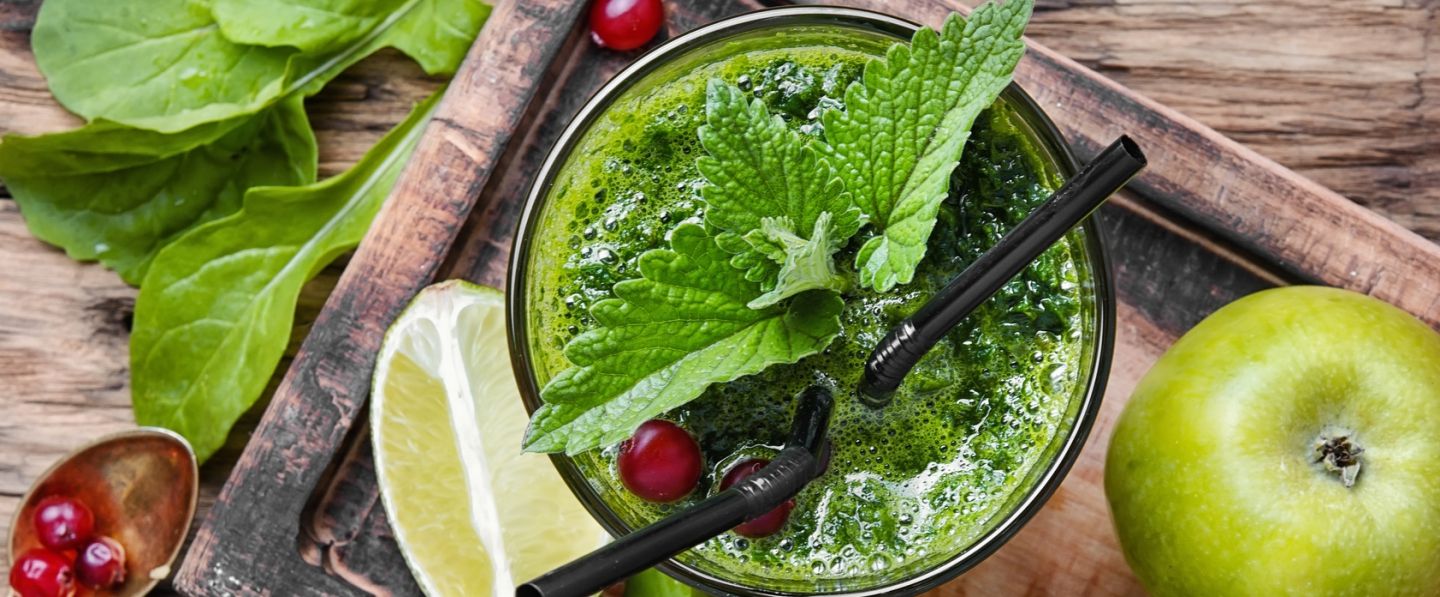 Smoothie vert aux feuilles d’épinard, menthe, pomme et groseille