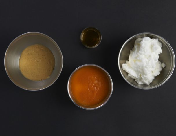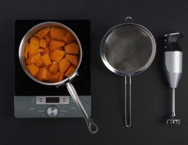 Eplucher et couper en morceaux la courge. Faire cuire pour réaliser une purée. Egoutter et mixer la purée de courge. En réserver 100g.