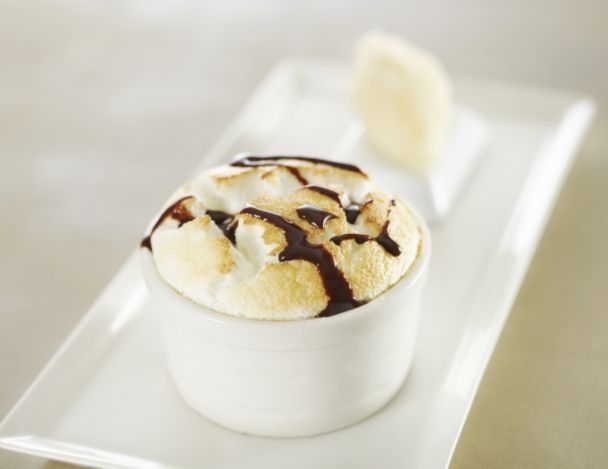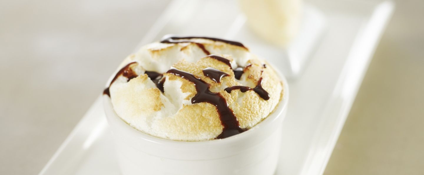 Servir les soufflés avec un trait de sauce chocolat, et une boule de sorbet poire - jasmin.