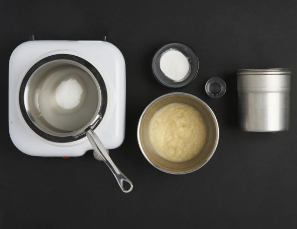 Porter à ébullition l’eau, le sucre, le glucose atomisé. Verser sur la purée de poire. Ajouter l’essence. Passer en sorbetière.