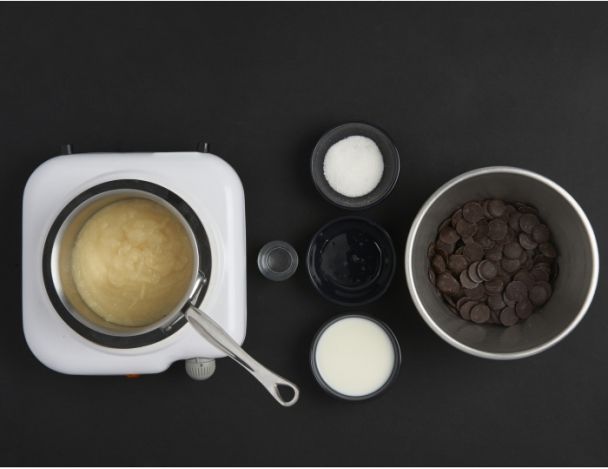 Chauffer tous les ingrédients sauf le chocolat. Verser ceux-ci sur le chocolat. Réserver.