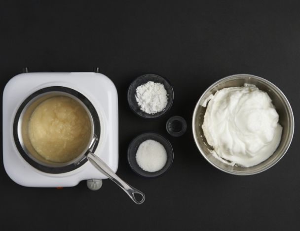 Monter à ébullition la purée de poire, les 20g de sucre et l’alcool de poire Williams. Ajouter la fécule et cuire comme une crème pâtissière. Monter les blancs en neige et serrer avec les 23g de sucre. Ajouter les blancs dans le mélange chaud.