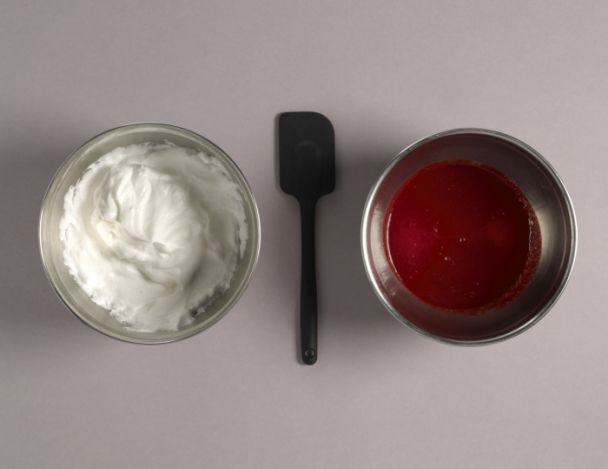 Monter les blancs et les serrer avec les 100 gr de sucre ,incorporer au précédent mélange en deux temps :1/3 de « meringue » dans la framboise,puis la framboise allégée dans la cuve des blancs