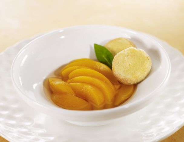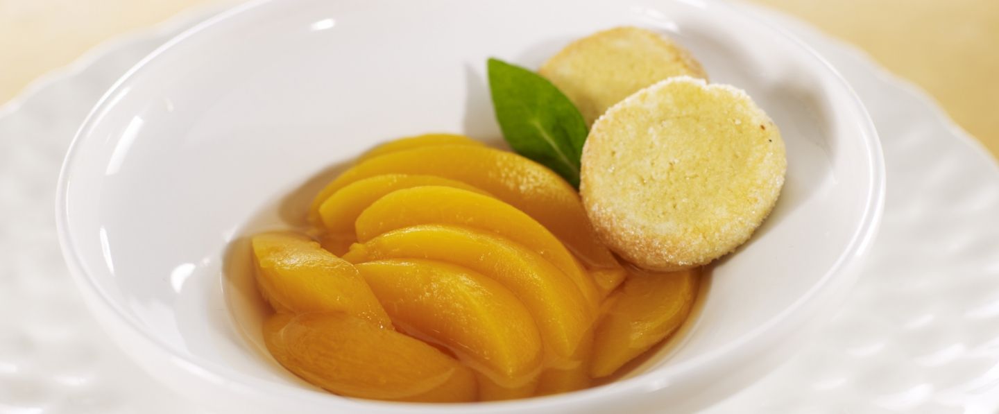 Disposer les pêches dans des assiettes creuses, ajouter du sirop puis un sablé diamant par assiette et dresser.