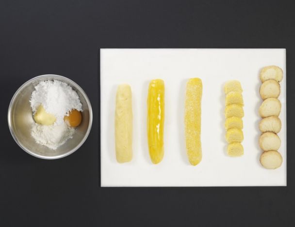 Mélanger le beurre avec le sucre. Ajouter la farine et le jaune d'œuf. Bien mélanger. Former une boule avec la pâte et laisser refroidir au réfrigérateur. Mélanger un jaune d'œuf avec un peu de sucre. Une fois la pâte refroidie, faire des boudins, les rouler dans le mélange œuf et sucre. Couper les boudins en rondelles et les disposer sur une plaque. Cuire à 160°C pendant 20 minutes.