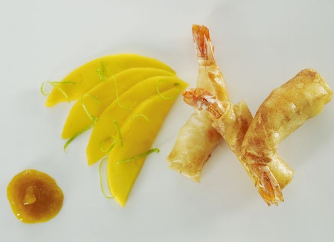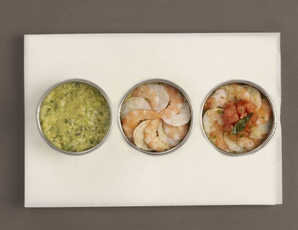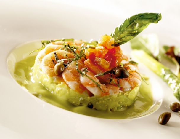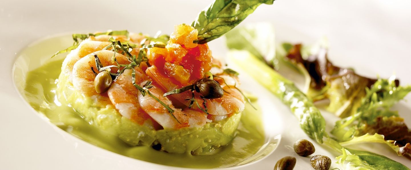 Dresser sur assiette la rosace de crevettes, disposer autour un peu de crème d’avocat, accompagner avec un bouquet de salade de mesclun.