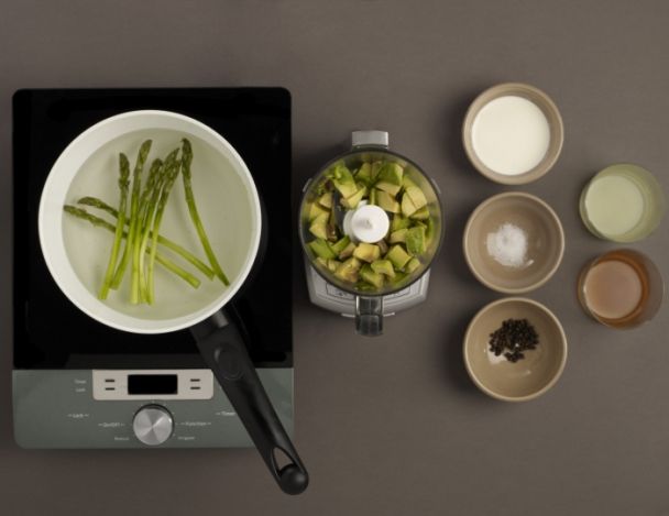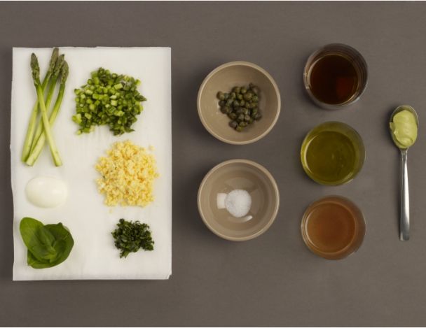 Cuire un oeuf dur et le passer au tamis. Couper les asperges en petits dés. Hacher le basilic en mettant de côté quelques feuilles. Mélanger les asperges en petits dés, l’œuf dur passé au tamis, les câpres, le basilic haché, le vinaigre de Xérès, le sel, le Tabasco et l’huile d’olive, lier ensuite avec une cuillère de purée d’avocat.
