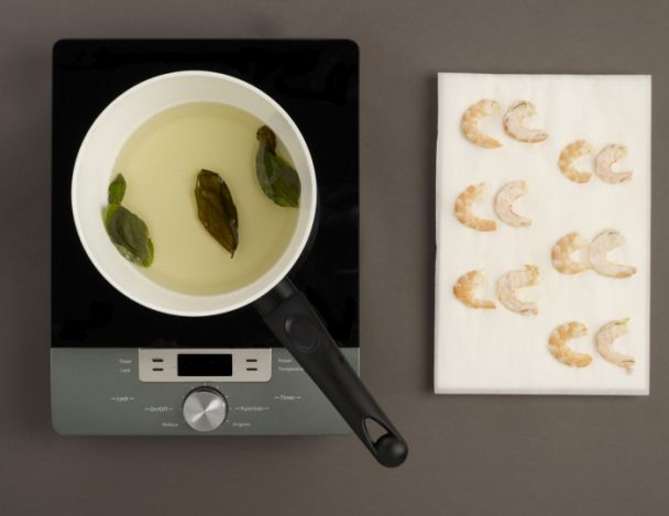 Couper les crevettes décortiquées en deux, et assaisonner avec une vinaigrette à l’huile d’olive.